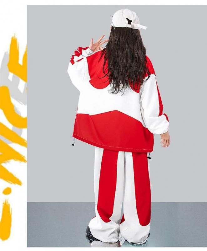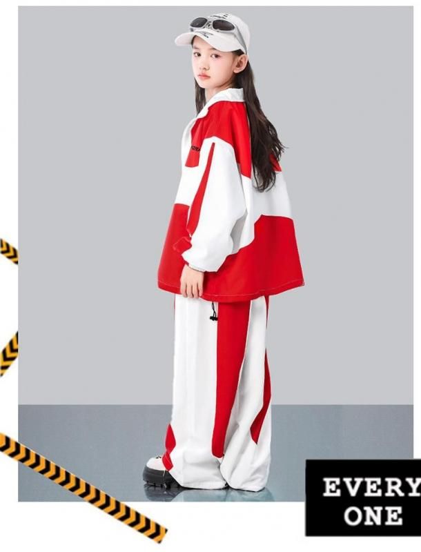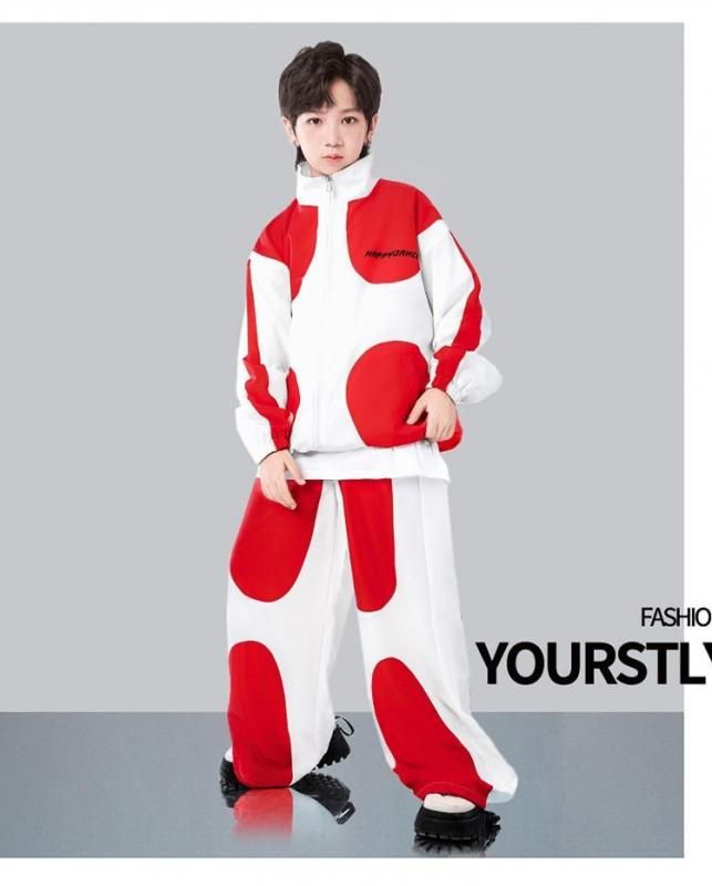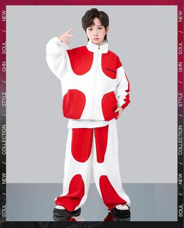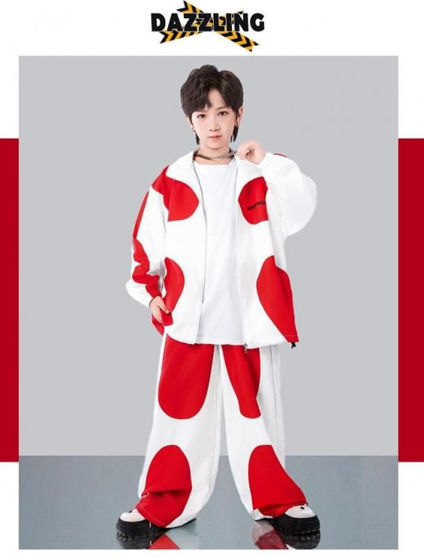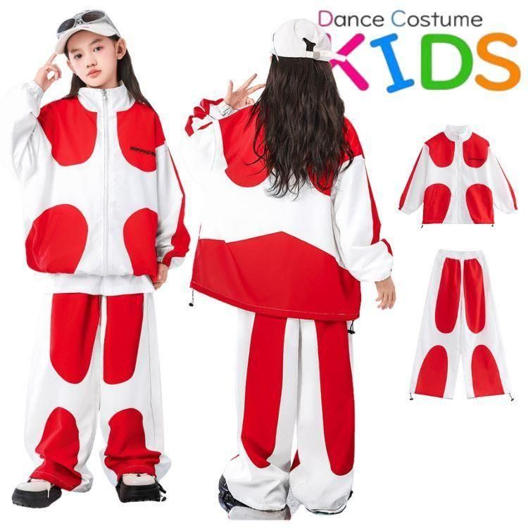 キッズ ダンス ヒップホップ ジャズダンス ステージ衣装 子供服 団体服 練習着 演出服 セットアップ 赤い斑点アウター  ロングパンツ 女の子 男の子 ユニセックス