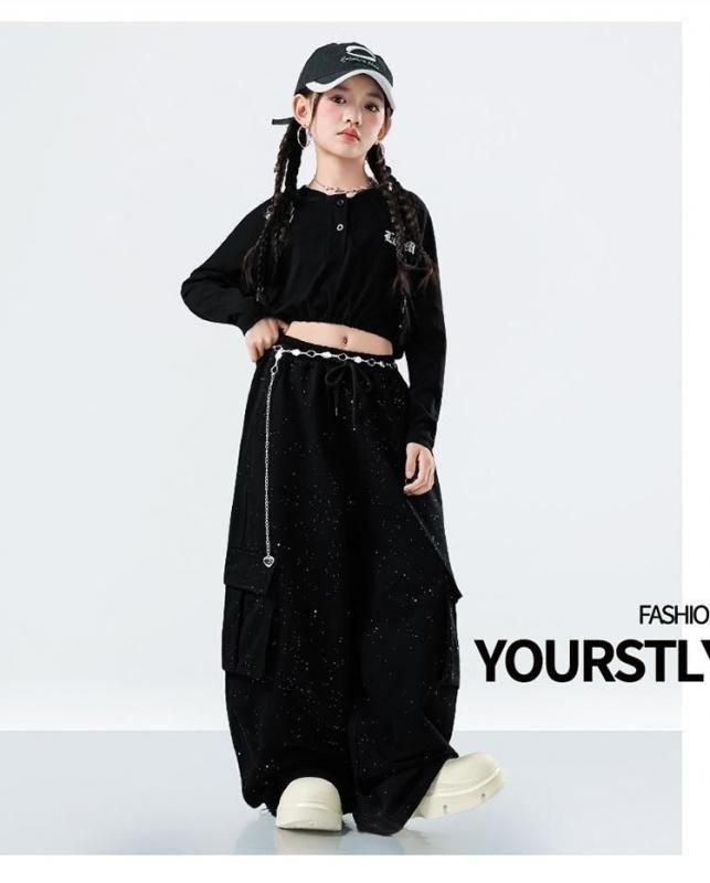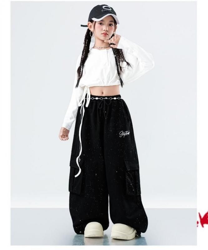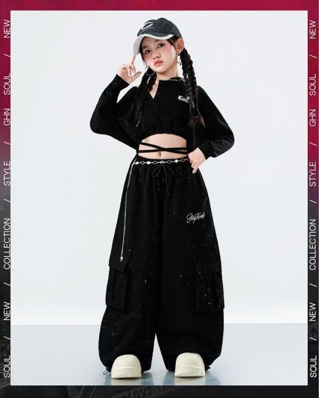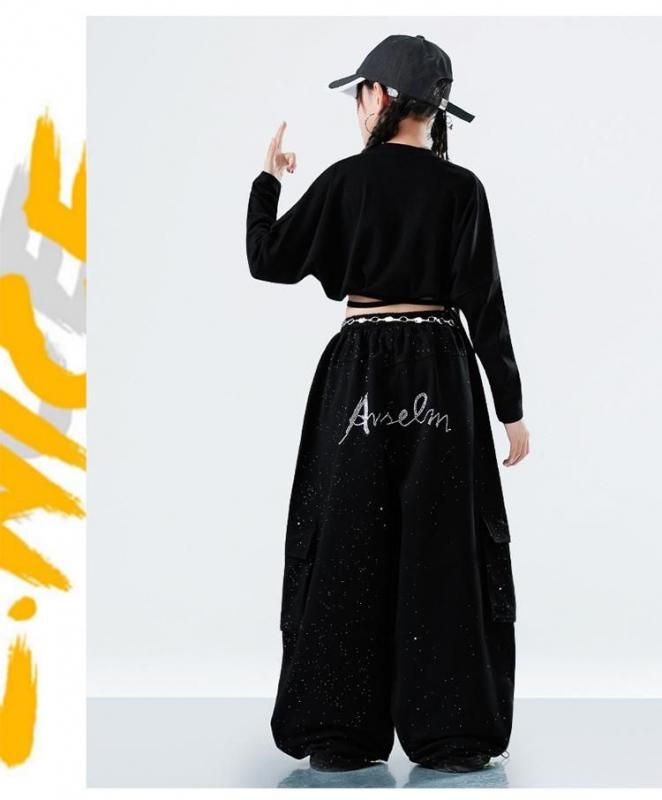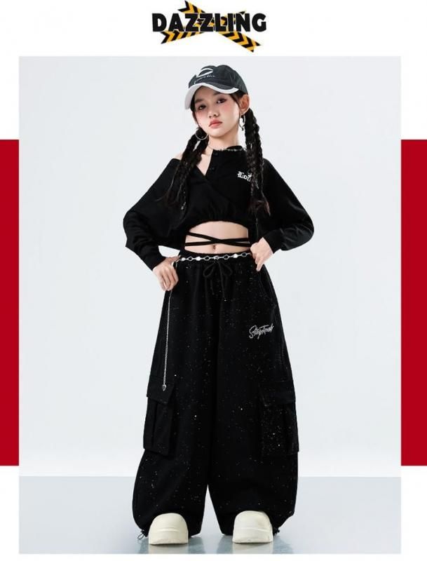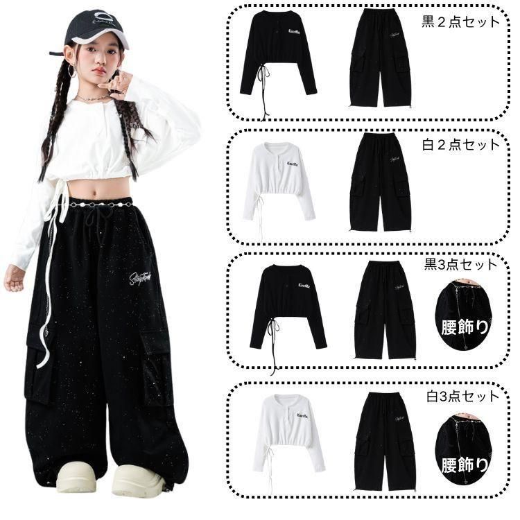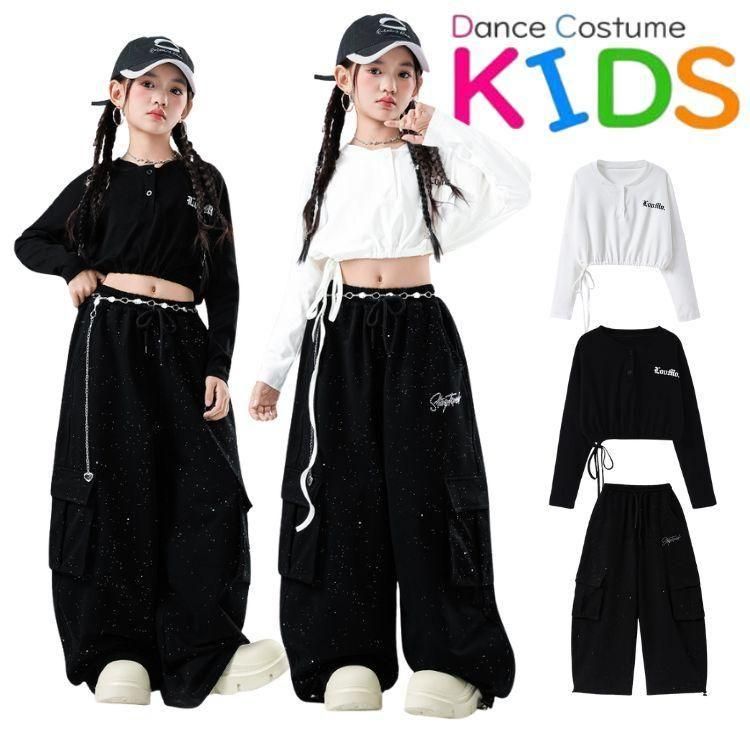 キッズ ダンス ヒップホップ ダンスウェア 女の子 ギャル 子供 服 セットアップ へそ出す長袖 ドローコード スパンコールパンツ キラキラ ス ステージ衣装 jazz HIPHOPジャズダンス